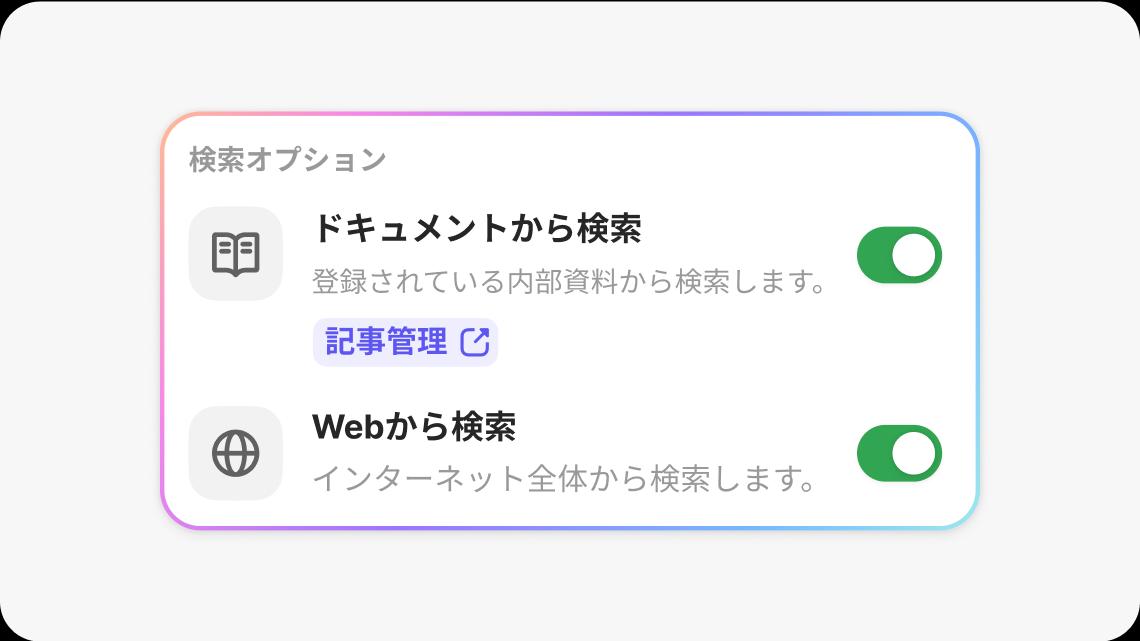 検索内容に応じて、ドキュメント検索とWeb検索のON/OFFの設定が可能です。
