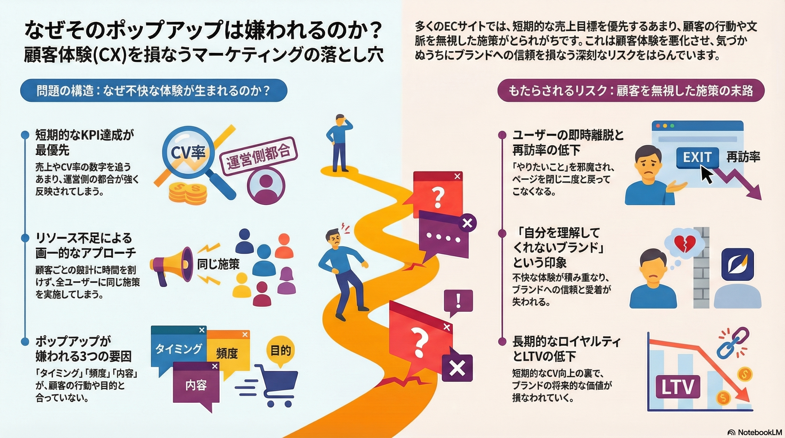ECサイトを運営していると、「売上」や「CVR(コンバージョン率)」に追われ、ポップアップなどの施策もつい運営側の都合で設計しがちです。その結果、「このポップアップ、本当に顧客に必要な体験になっているのか?」と感じる場面もあるのではないでしょうか。