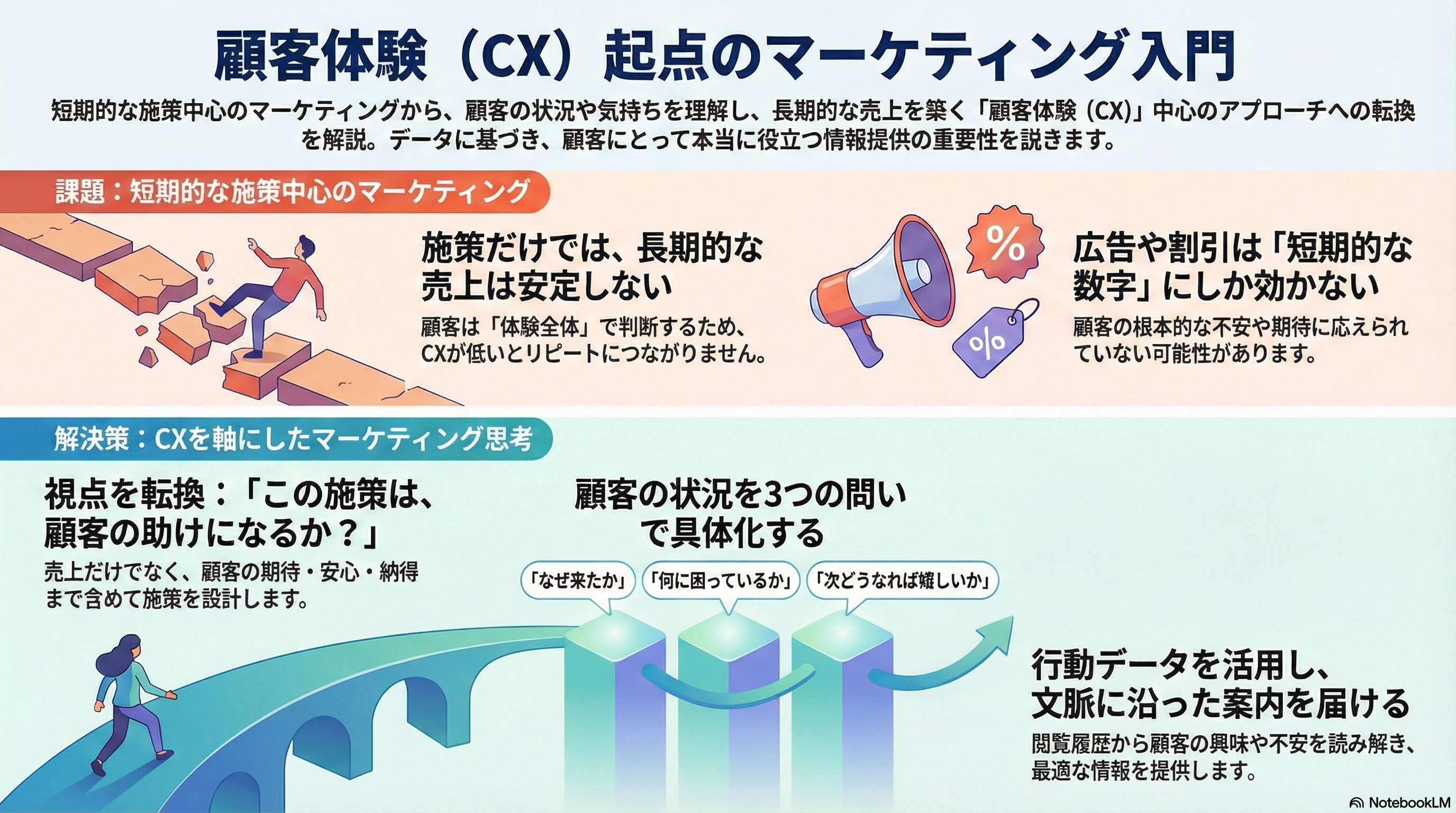 一方通行の発信から、顧客の文脈に合わせた案内へと切り替えることが、CXを高めるマーケティングの土台になっていきます。