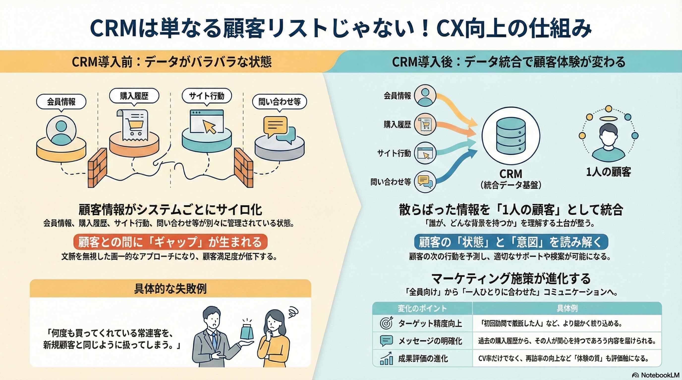 CRMの役割は、バラバラに散らばった顧客情報をひとつにまとめ、同じ“1人の顧客”として認識できるようにすることです。それによって「誰が、どんな背景を持ち、これまでどのような体験をしてきたのか」を理解しやすくなり、CXを意識したコミュニケーション設計の前提が整います。