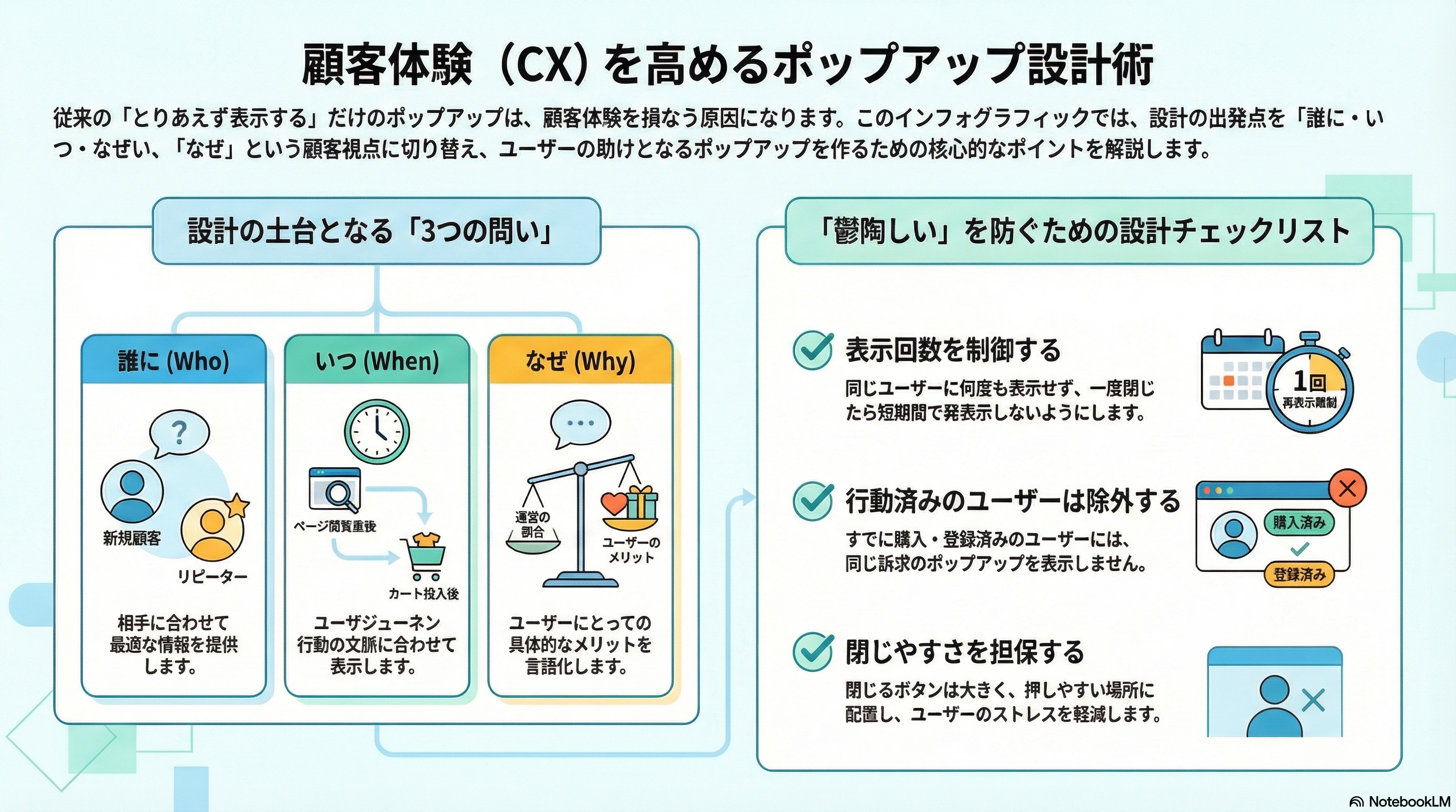 ポップアップは、顧客体験を補助するための“案内役”なのか、それとも押しつけになっているのか。その違いは、この設計の精度に大きく依存します。