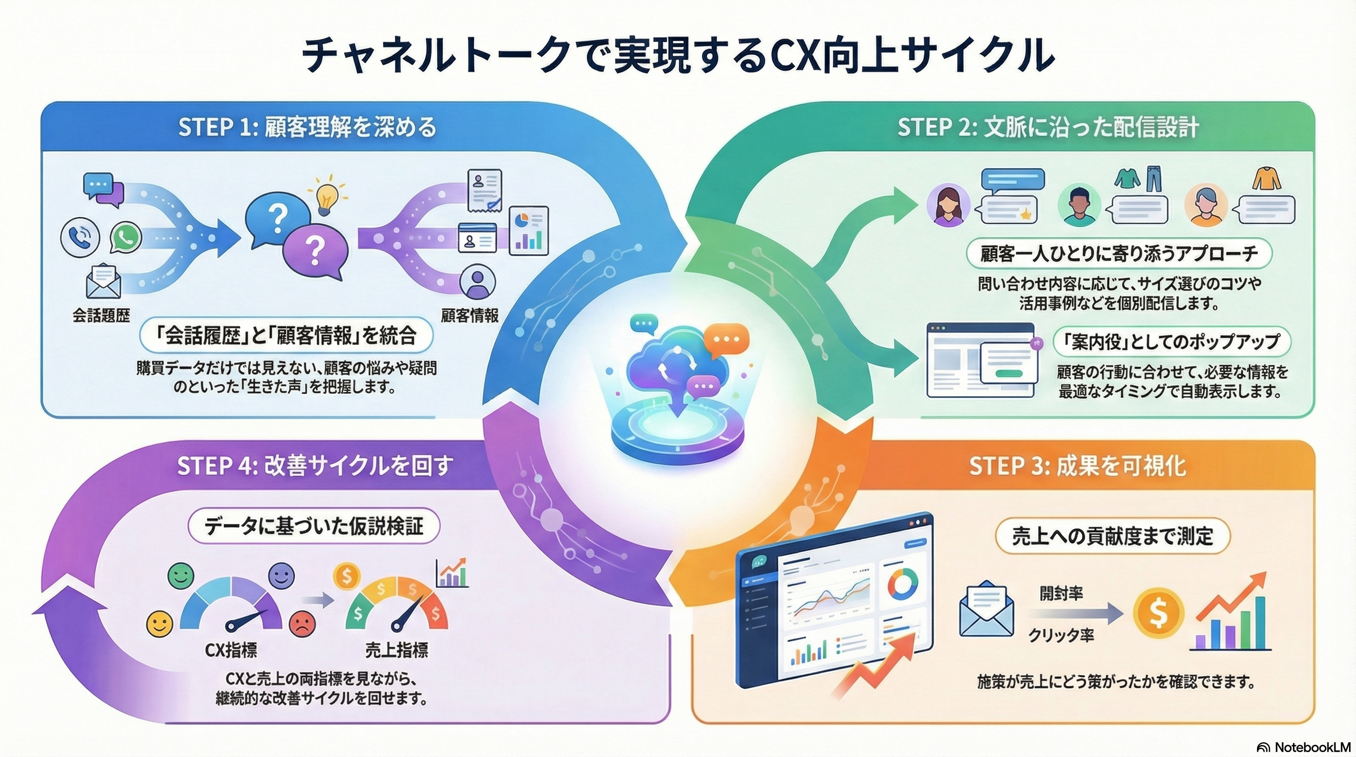 このように、チャネルトークで日々届く“生の声”をヒントにしながら、ポップアップやサイト内の導線を少しずつ改善していくと、CXと成果の両方を高めるサイクルが自然と回り始めます。