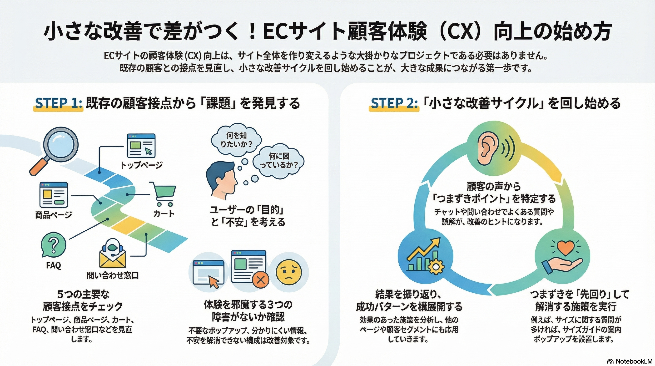 一気にサイト全体を作り替える必要はありません。気になる接点を一つ決めて、小さな改善を積み重ねていくことが、結果的に大きな顧客体験の差につながっていきます。