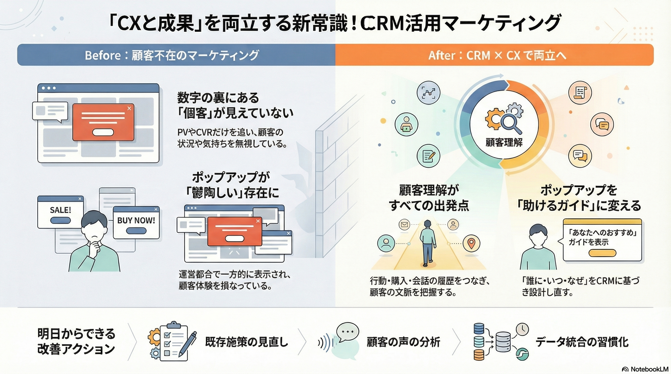 「誰に・いつ・なぜ」表示するのかを、CRMに基づいて設計し直すことで、鬱陶しい存在から、顧客を助けるガイド役へと変えていくことができます。
