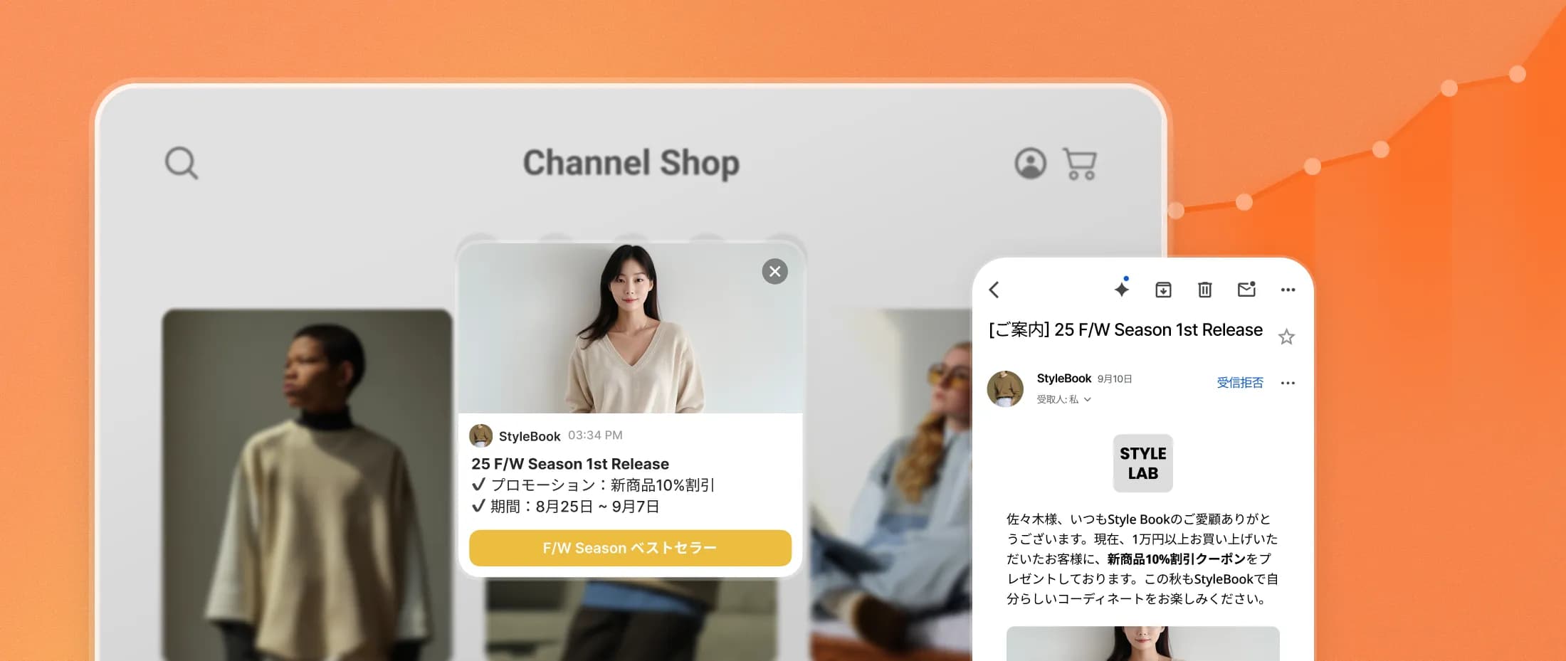 店舗での接客のように、顧客に必要な瞬間に顧客に合ったメッセージを送信できます。案内文や画像をカスタマイズしてブランドの雰囲気を表現できます。