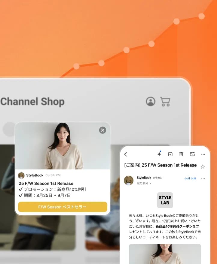 チャネルトークのマーケティング機能を活用して、顧客の様々な購入体験に合わせてカスタマイズされたメッセージを送信しました。カートに入った金額に応じて特典を案内したり、顧客の訪問時間帯に合わせて専用の特典メッセージを表示したりしています。