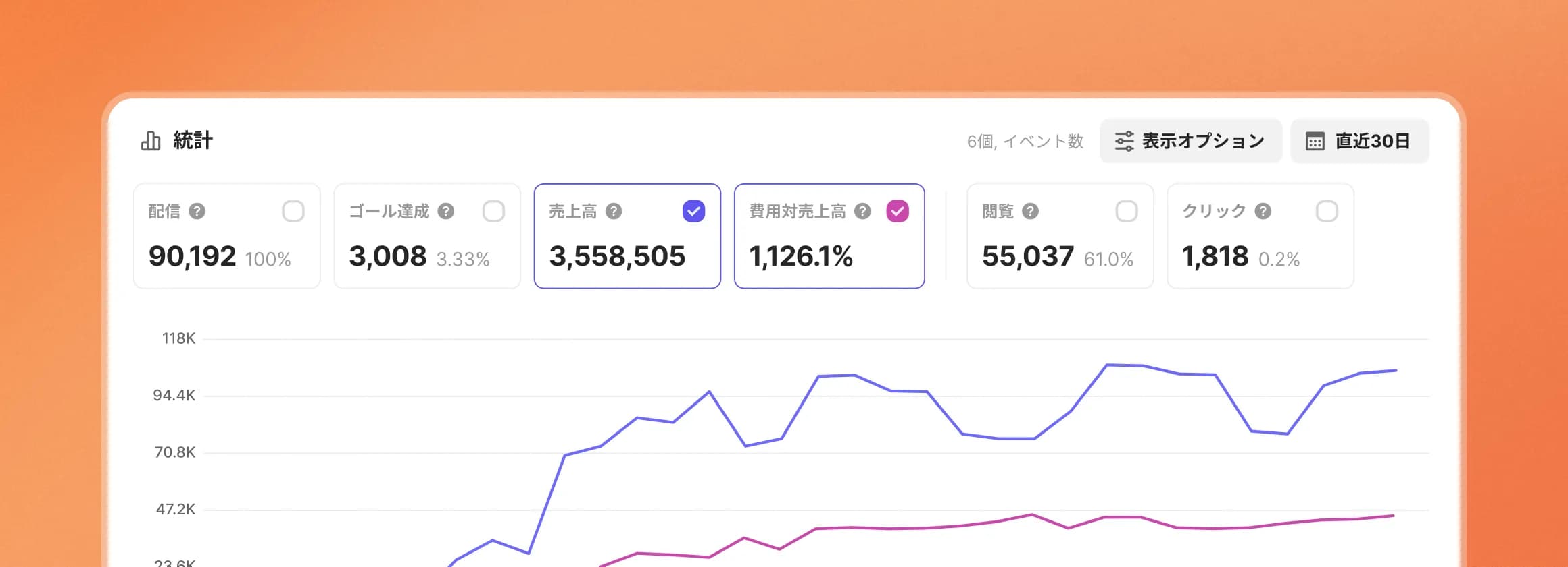 配信数、閲覧率、クリック率でマーケティングの成果を一目で確認できます。売上とROASまで分析して実際の効果を明確に把握し、成果を体系的に管理できます。