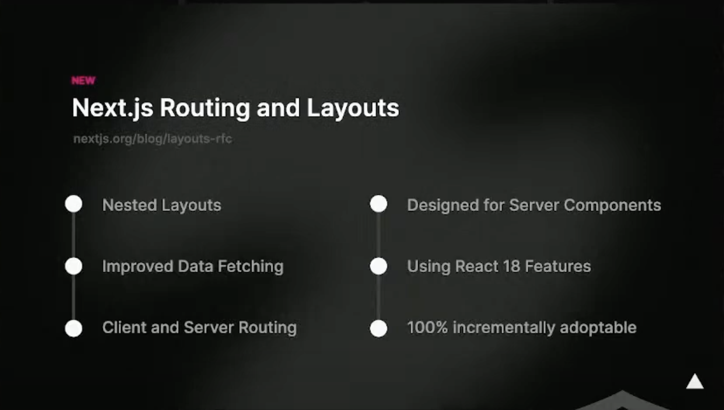 Next.js 프로젝트를 리드 하고 있는 Vercel 팀에서 일하고 있는 Delba de Oliveira의 'Routing in React 18 and Beyond' 세션에서 이것에 대해서 자세히 이야기 들을 수 있었습니다. Next.js의 새로운 라우터는 Server Components를 기반으로 구현되어 있으며, 새로운 Concurrent 기능을 최대한 활용할 수 있도록 설계되었다고 합니다.