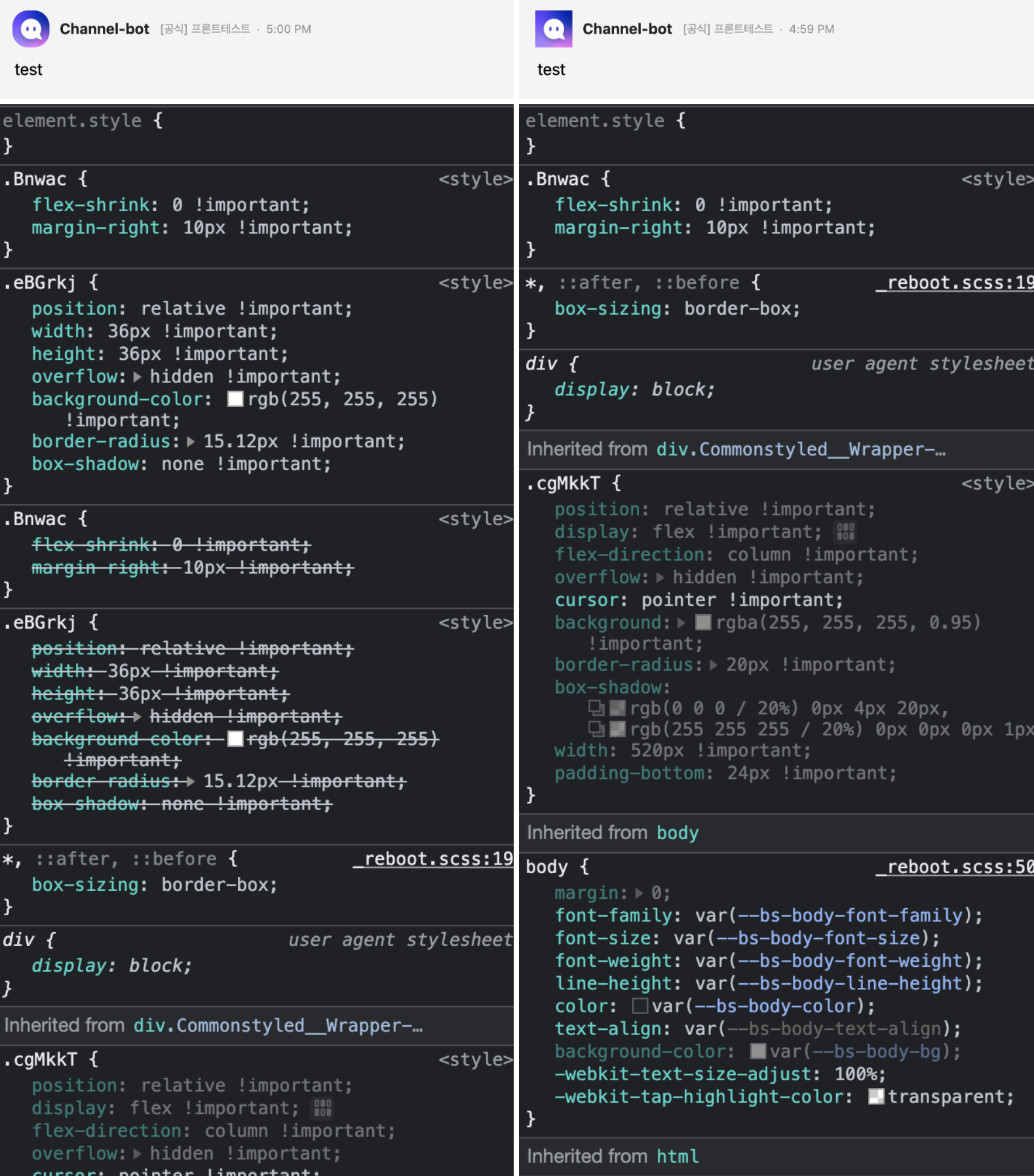 채널톡에서는 iframe 밖에 DOM을 렌더링하는 경우 StyleSheetManager를 쓰고 있습니다. iframe 밖에서는 내부의 styleSheet을 참조할 수 없기 때문이죠.