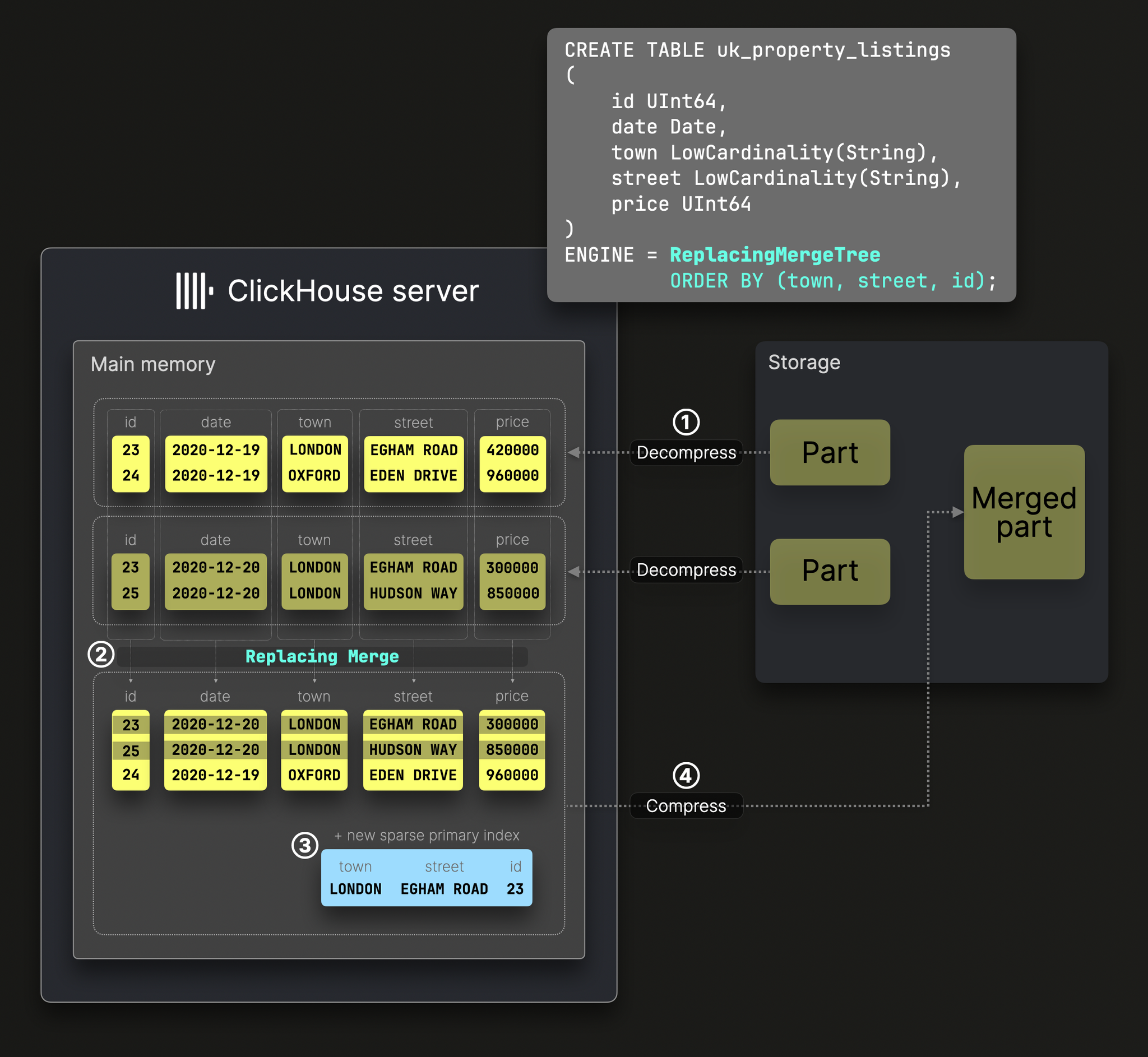 그림 2. ReplacingMergeTree의 Merge 및 Compress 과정 [2]