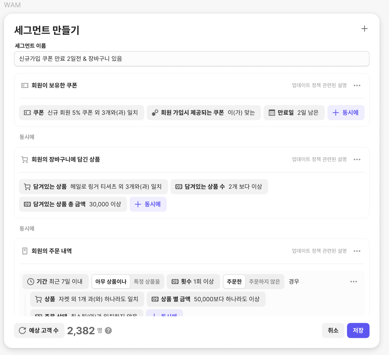 그림 1. 채널톡의 커머스 데이터 세그먼트 작성 화면