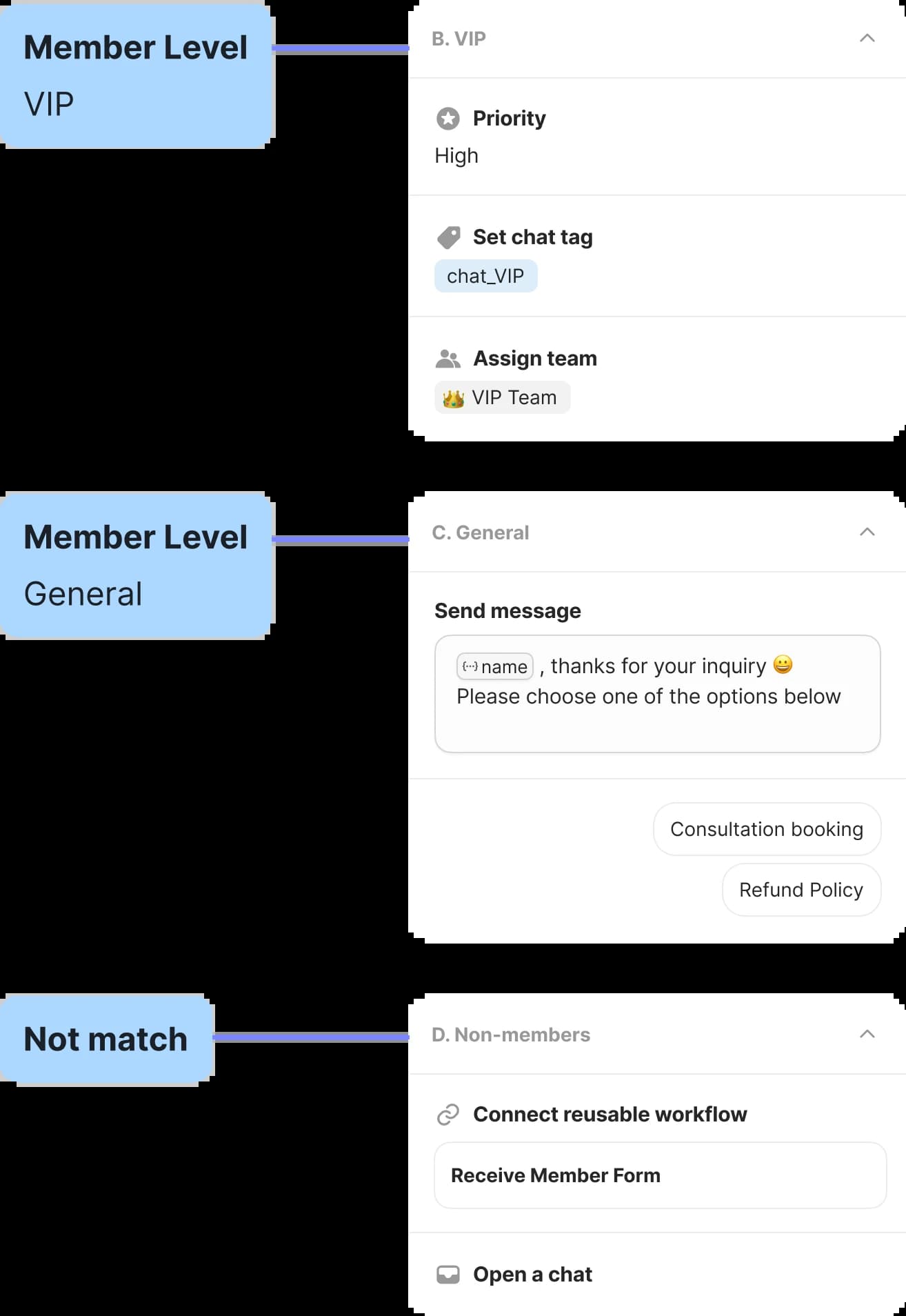 Automatically activate chatbots, apply tags, and assign teammates based on customer status and inquiry type.